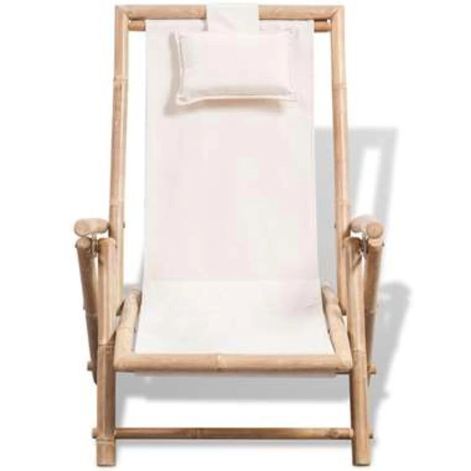 Deze ligstoel van bamboe en canvas is ideaal om in te ontspannen op je terras of in je tuin.
